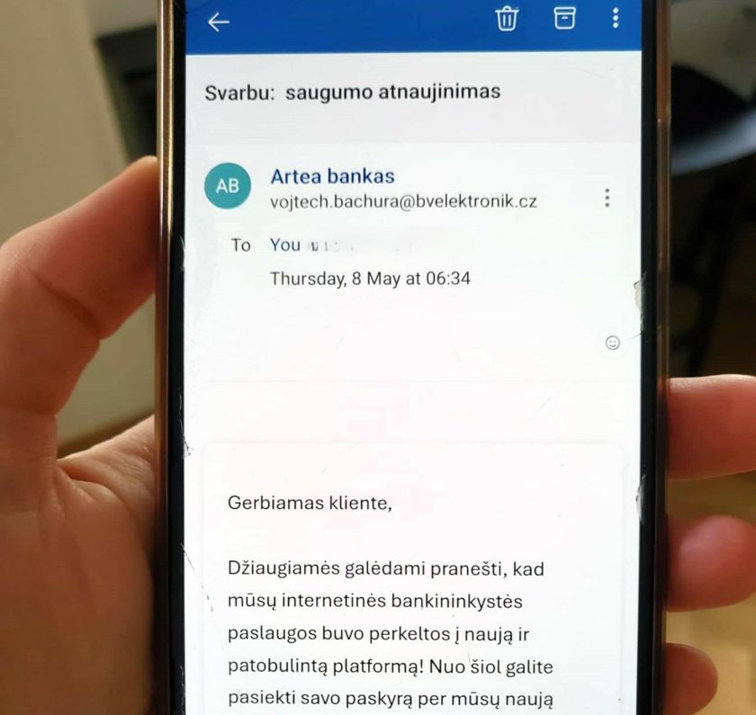 „Artea“ bankas prašo visų elgtis budriai. Jokie bankai nesiunčia gyventojams laiškų ir neprašo prisijungti per nuorodą bei patvirtinti savo tapatybę ar pateikti kitus duomenis, suvesti kodus.