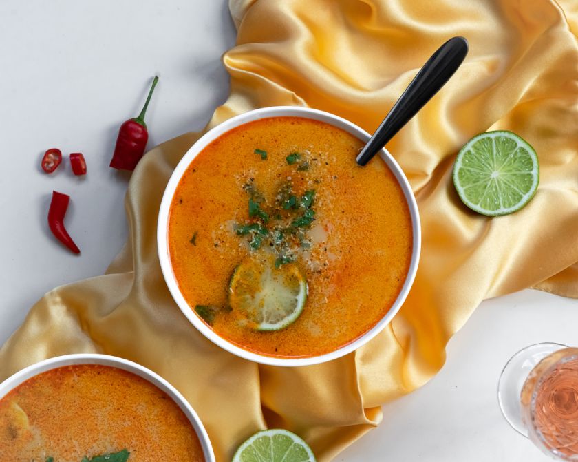 Jums reikės: 1 raudonosios paprikos, 5 pievagrybių, 1 svogūno, 2 skiltelių česnako, 2 šaukštelių šviežio tarkuoto imbiero, 400 ml (vienos skardinės) kokosų „pieno“, 2 šaukštų raudonosios kario pastos, 1 žaliosios citrinos, 1 l vandens, 2 daržovių sultinio kubelių, šiek tiek aliejaus ir šviežių petražolių (nebūtina).