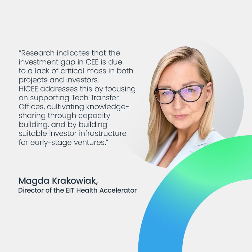 „Tyrimai rodo, kad investicijų trūkumas Vidurio ir Rytų Europoje susidarė, nes trūksta tiek projektų, tiek investuotojų kritinės masės. HICEE sprendžia šią problemą, daugiausia dėmesio skirdama Technologijų perdavimo biurų rėmimui, dalijimuisi žiniomis ugdant gebėjimus ir kuriant tinkamą investuotojų infrastruktūrą ankstyvojo etapo įmonėms. Programoje orientuojamasi į specifinius iššūkius, su kuriais susiduria sveikatos ir gyvybės mokslų startuoliai, ir siekiama suteikti suinteresuotosioms šalims žinių, reikalingų sėkmingam įėjimui į rinką“, – aiškina „EIT Health Accelerator“ direktorė Magda Krakowiak.