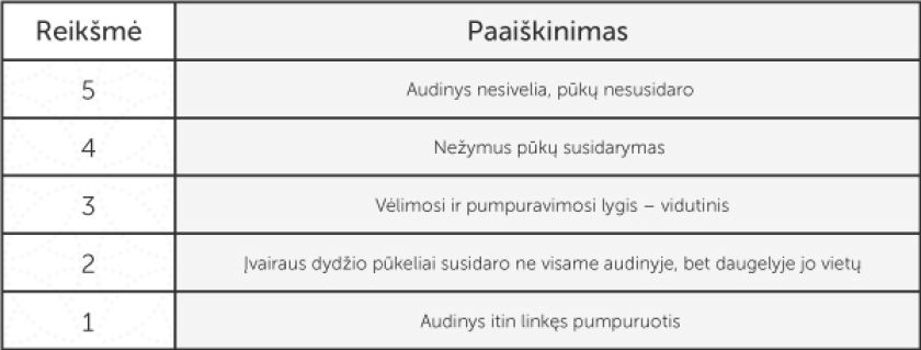 Pastaba: 100 proc poliesterio audiniai turi itin aukštą Martindeilo rezultatą (nuo 80 000 ir daugiau), todėl Martindeilo testo skalė naudinga tik iš natūralių medžiagų pagamintiems audiniams.