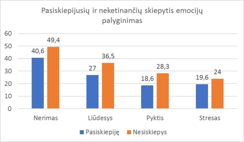 Tyrimas atskleidė įdomų faktą, kad emocinės reakcijos labai skiriasi pasiskiepijusių (72,5 proc. apklaustųjų) ir neketinančių skiepytis (14,1 proc. apklaustųjų) grupėse. Nesiskiepijantys 22-52 proc. dažniau patiria įvairias neigiamas emocijas nei paskiepytieji. Skirtumai ypač ryškūs vertinant nerimą, pyktį ir liūdesį. 40,6 proc. pasiskiepijusių patiria nerimą, lyginant su 49,4 proc. nesiskiepijančių, pyktį – 18,6 proc. pasiskiepijusių ir 28,3 neketinančių skiepytis, Liūdesį, atitinkamai 27 proc. ir 36,5 proc. G. Chomentauskas sako: „Juokaujant galime teigti, kad vakcinacija atlieka psichoterapinį vaidmenį, nes suteikia tam tikrą apsaugą ir, atitinkamai, ramybę. Jei rimtai, greičiausiai didelę įtaką daro esami apribojimai nepasiskiepijusiems, tam tikra socialinė atskirtis ir jiems gręsiantys dar didesni ribojimai.“