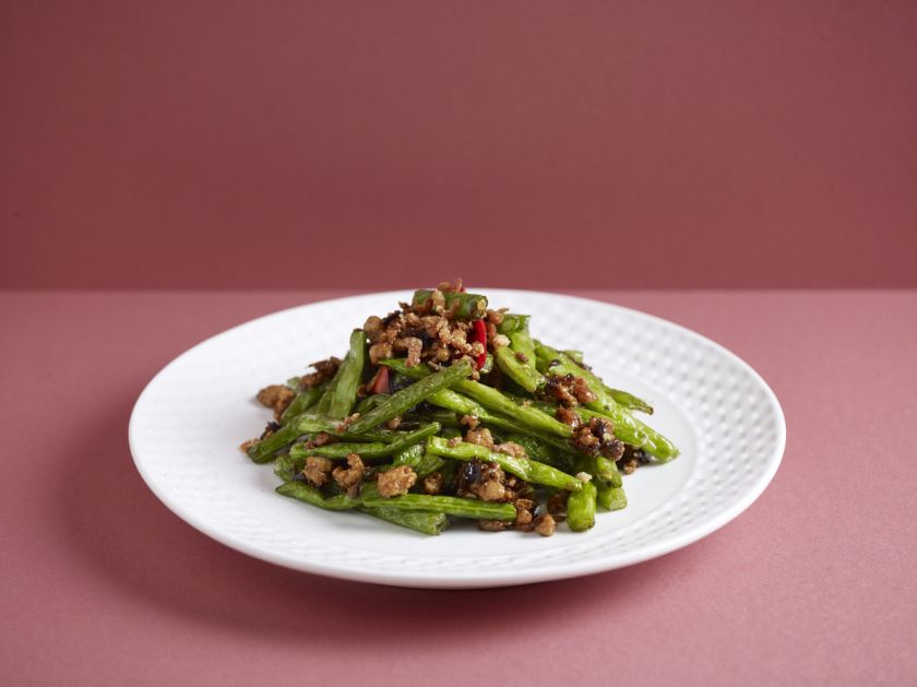 Reikės: 400 g smulkintos kiaulienos, svogūno, raudonosios paprikos, 150 g žaliųjų pupelių, 50 ml sojos padažo, 50 ml vandens, 2 šaukštų aliejaus, šaukšto medaus, pusės aitriosios paprikos, saujos smulkintų svogūnų laiškų, skiltelės smulkinto česnako, šiek tiek tarkuoto imbiero.