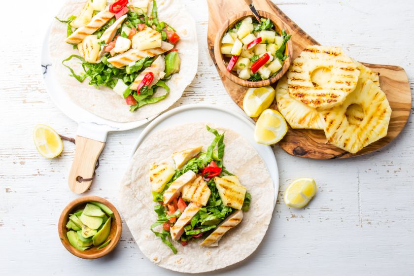 Į dubenį su ananasais sudėkite agurkus ir supilkite ryžių vyno actą. Tuomet apšlakstykite alyvuogių aliejumi ir pagal skonį pagardinkite druska bei pipirais. Tortilijas pakaitinkite sumuštinių kepyklėje arba lėkštėje mikrobangų krosnelėje (apie 10 sekundžių, kol sušils).
